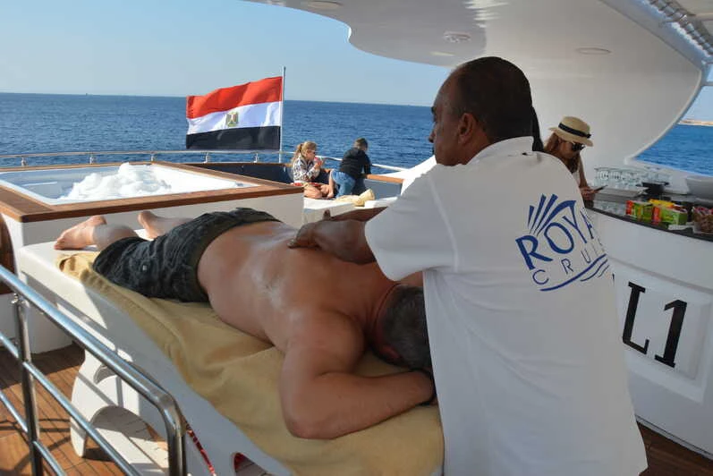 Experience a luxury cruise trip to Egyptian Caribbean Islands & discover marine life by snorkeling, water sports, and fishing. Enjoy a relaxing and professional massage on board & a buffet lunch.