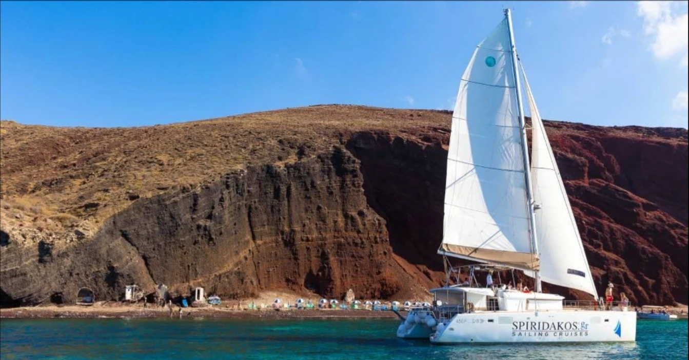 Setting sail from Vlychada Marina and cruising along the coastline, we arrive at Akrotiri’s Red Beach, admired for its distinct red hue, caused by the rich in volcanic minerals soil. Next we sail towards the White Beach. Then we sail towards Mesa Pigadia for a swim break. Snorkeling gear and towels are provided to all our guests. Later, we pass the Lighthouse and enter the Caldera for a unique view of the whole bay. Our sailing route includes a close sail by the volcano crater and a full view of it.Our next stop is at the Hot Springs. This is where our second swim break takes place in the sulfurous waters that provide a natural spa. With the breathtaking views of Thirassia Island as a backdrop matching the picturesque Village of Oia, your Santorini Sailing experience shall culminate in the most unique and unforgettable way possible.